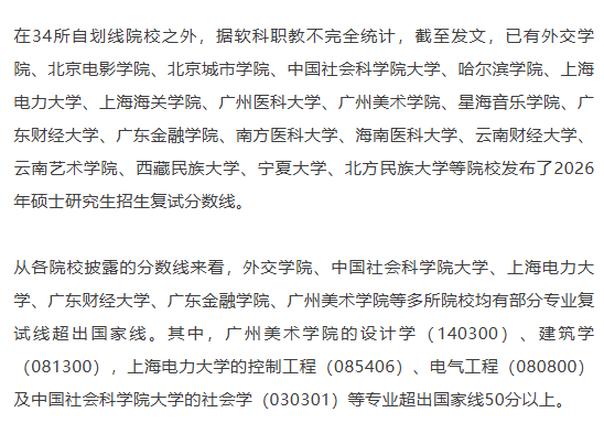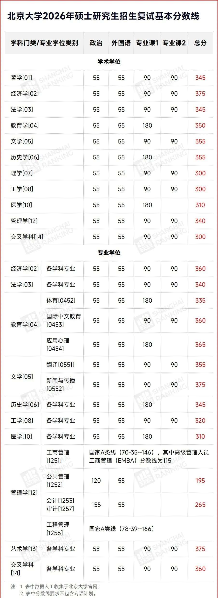 截至发文,上述“自主划线院校”中的北京大学和清华大学已披露复试线,其中,北京大学2026年硕士研究生招生复试基本分数线如下: