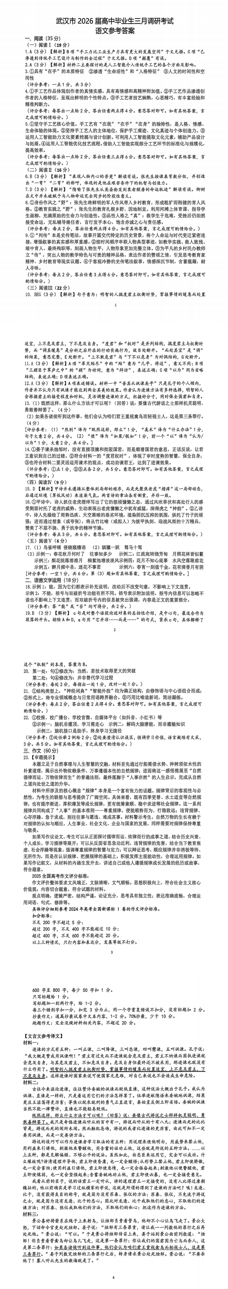 2026年武汉市高三3月语文试卷+答案